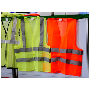 High-visibility fluorescent vests with reflective tape, available in multiple colours and sizes